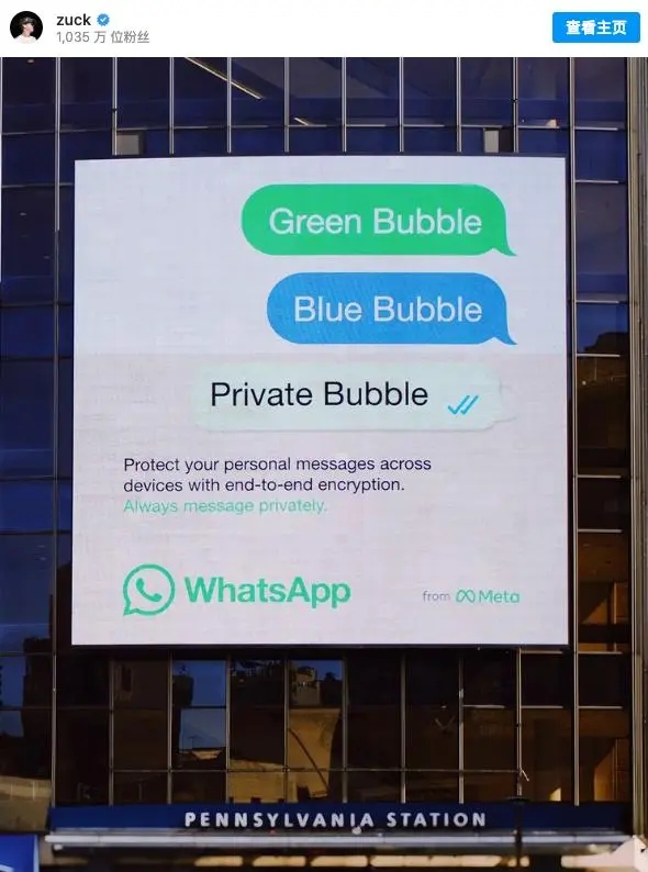 软餐获悉,Meta 公司创始人马克·扎克伯格本周一发帖称,其即时消息应用程序 WhatsApp 的安全性要比苹果的 iMessage 更高。他表示这是因为 WhatsApp 在 Android 和 iOS 上使用了端到端加密(包括群聊),而 iMessage 在向 Android 设备发送消息时会转为不安全的 SMS(绿泡泡短信)。他还指出 WhatsApp 拥有而 iMessage 没有的一些功能,比如聊天阅后即焚和端到端加密备份。因此扎克伯格呼吁用户转而使用 WhatsApp 。扎克伯格的帖子还附上了 WhatsApp 在宾夕法尼亚车站投放的一副户外广告,广告公开嘲讽苹果 iMessage 针对安卓设备的 “绿泡泡” 信息做法。
