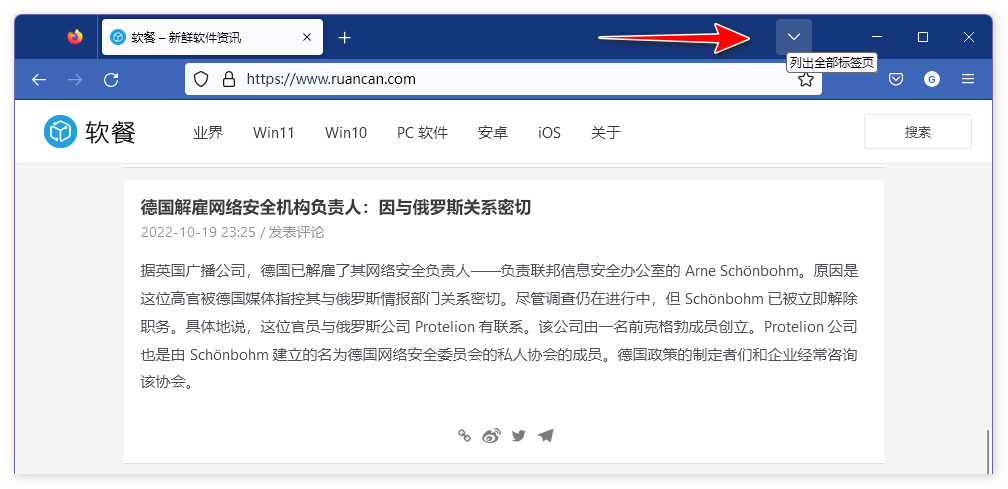 Firefox 106 稳定版已在近日发布,软餐(ruancan.com)注意到,新版 Firefox 将默认显示「列出所有标签页」按钮(如图),即使只打开了一个标签页。这显得有些多余。好在 Firefox 106 上存在一个标记可用来隐藏这个按钮。