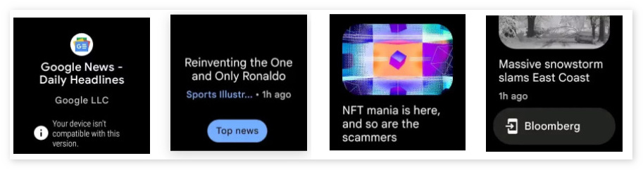软餐获悉,谷歌的新闻应用程序 Google News 已经为搭载 Wear OS 的智能手表推出了适配版本。尽管该应用尚未发布到 Play 商店,但其界面已经曝光。 Google News 应用为 Wear OS 提供了适应于其微型显示屏的全新布局,它提供 “头条新闻” 及新闻图片预览,但尚不确定是否能在智能手表上直接阅读新闻原文。目前已知该应用可在 Galaxy Watch 4 和 Pixel Watch 上正常运行,尽管应用标记提示不兼容这两款手表。