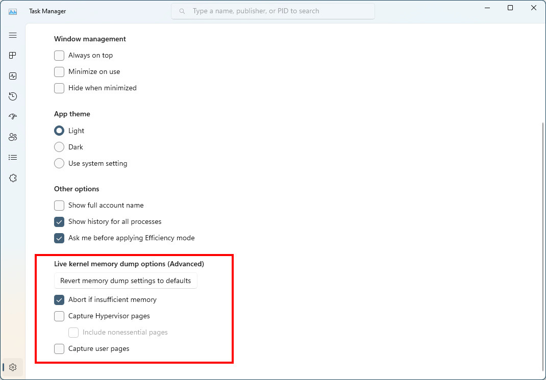 在任务管理器设置中配置实时内核转储选项。 [我们正开始推出这个功能,所以它还不能提供给 Dev Channel 中的所有 Insiders,因为我们计划在将它推出给每个人之前监控反馈并查看它是如何登陆的。]