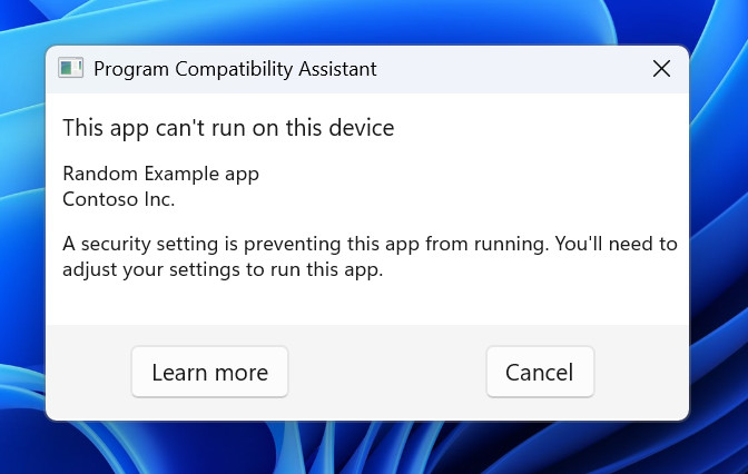 当应用程序存在已知兼容性问题时显示的对话框现在使用新的 Windows 11 设计。 [Windows 安全]