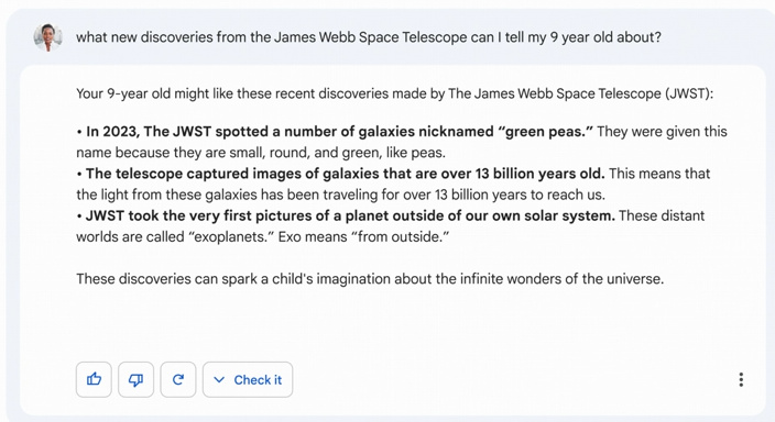 Bard 基于谷歌的对话应用程序语言模型 (LaMDA) 开发,谷歌首席执行官桑德尔·皮查伊 (Sundar Pichai) 表示,Bard 不仅能够处理简单问题的答案,还能处理更复杂的查询,比如询问如何向 9 岁的孩子提供关于詹姆斯·韦伯太空望远镜发现的信息。 Bard 也提供了类似于 ChatGPT 那样的顶/踩按钮,以便用户对其回答进行评价。不同的是,Bard 在答案末尾提供了一个 check 按钮,点击它可详细了解更多信息。