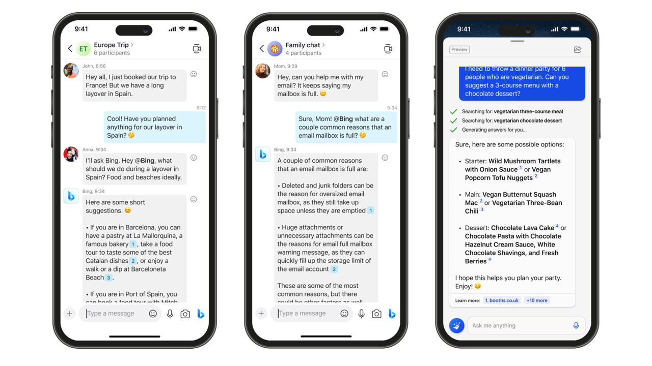 想象一下,当您与朋友和家人保持联系并计划下一次聚会时,有一位副驾驶。只需将必应添加到组中,就像添加任何 Skype 联系人一样,现在您可以让必应回答问题并为整个组提供信息。例如,如果您的家人正在谈论下一次家庭团聚,您可以简单地向 Bing 询问有关旅行目的地的建议、预计的天气预报和您旅行期间的有趣事件,聊天中的每个人都可以访问这些结果。当您与朋友聊天时,您可以让 Bing 简单地从网络上获取信息,例如,最新消息或昨晚的颁奖典礼,以添加到您的对话中。