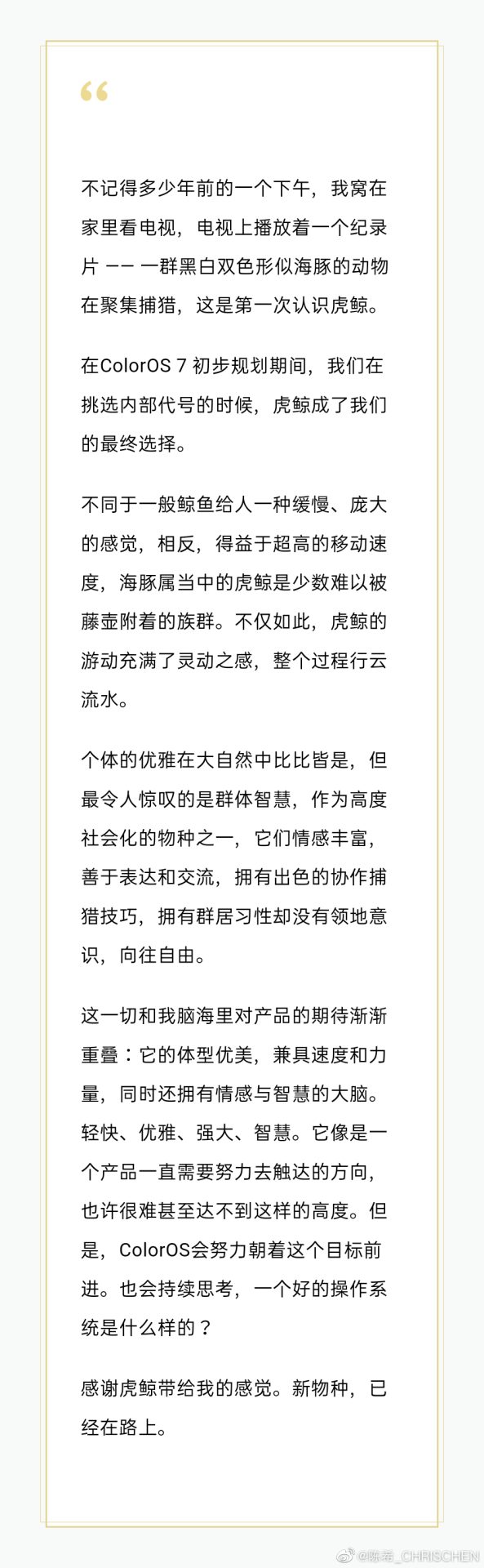 ColorOS 设计师陈希_CHRISCHEN 发布一则长文表达对于 ColorOS7 的设计灵感和追求目标。从其中我们可得知,之所以选择虎鲸作为代号,原因在于虎鲸游动时候姿态充满灵动之感,整个过程如同行云流水一般,而虎鲸所呈现的一切又与其设计师脑海中对于产品的期待层层重叠,例如体型优美之外,兼具速度和力量,再例如虎鲸拥有情感和智慧大脑。