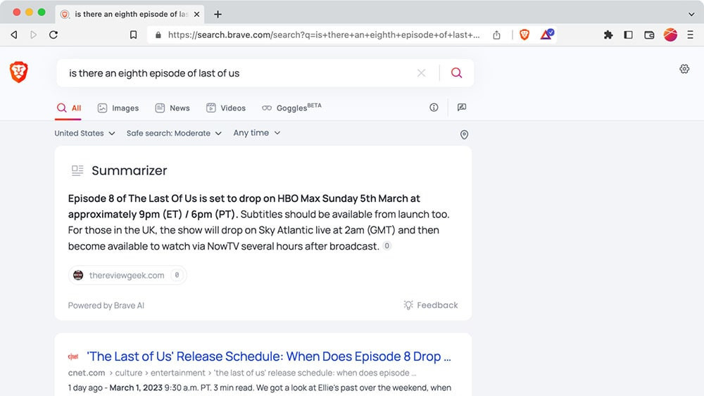 按照其他用户的分享,在 Brave Search 中键入一个完整的问题就能获得 Summarizer 提供的答案(位于搜索结果顶部),但软餐实测并未发现该功能,疑似该功能尚未全面推出。