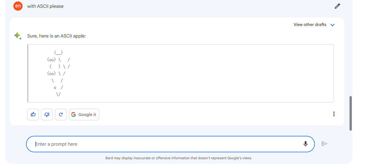 - Bard 拥有 ASCII 码绘图的能力,按照要求它画了一个苹果…(上图)