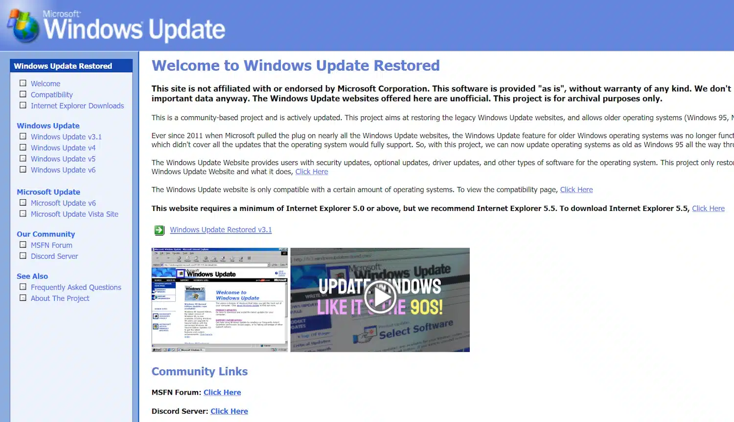 Windows Update Restored(链接)是一个由社区维护的网站,它专门为 Windows 的经典版本提供更新文件的下载。受到该网站支持的版本包括 Windows 95 、 Windows 98 、 Windows ME 、 Windows 2000 、 Windows XP 和 Windows NT 4.0 等。微软早就从官网删除了这些古老系统的更新。 Windows Update Restored 为希望继续运行这些版本的用户带来了福音。