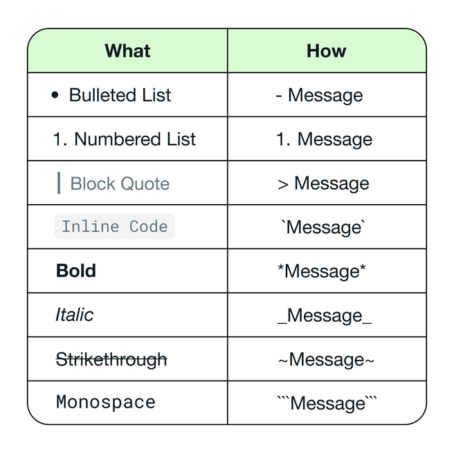 - Text can be formatted as block quotes by adding “>” before the message, similar to most rich text editors.