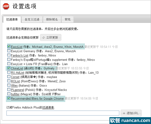 Adblock Plus 默认勾选了 “EasyList” 、 “ChinaList” 和 “Recommended filters for Google Chrome” 三个列表,这用来屏蔽一般网站的广告够用了。我们无需了解细节,只要直接使用即可。但不要开启太多的屏蔽列表,否则太多的列表会使你的 Chrome 浏览器运行变慢。