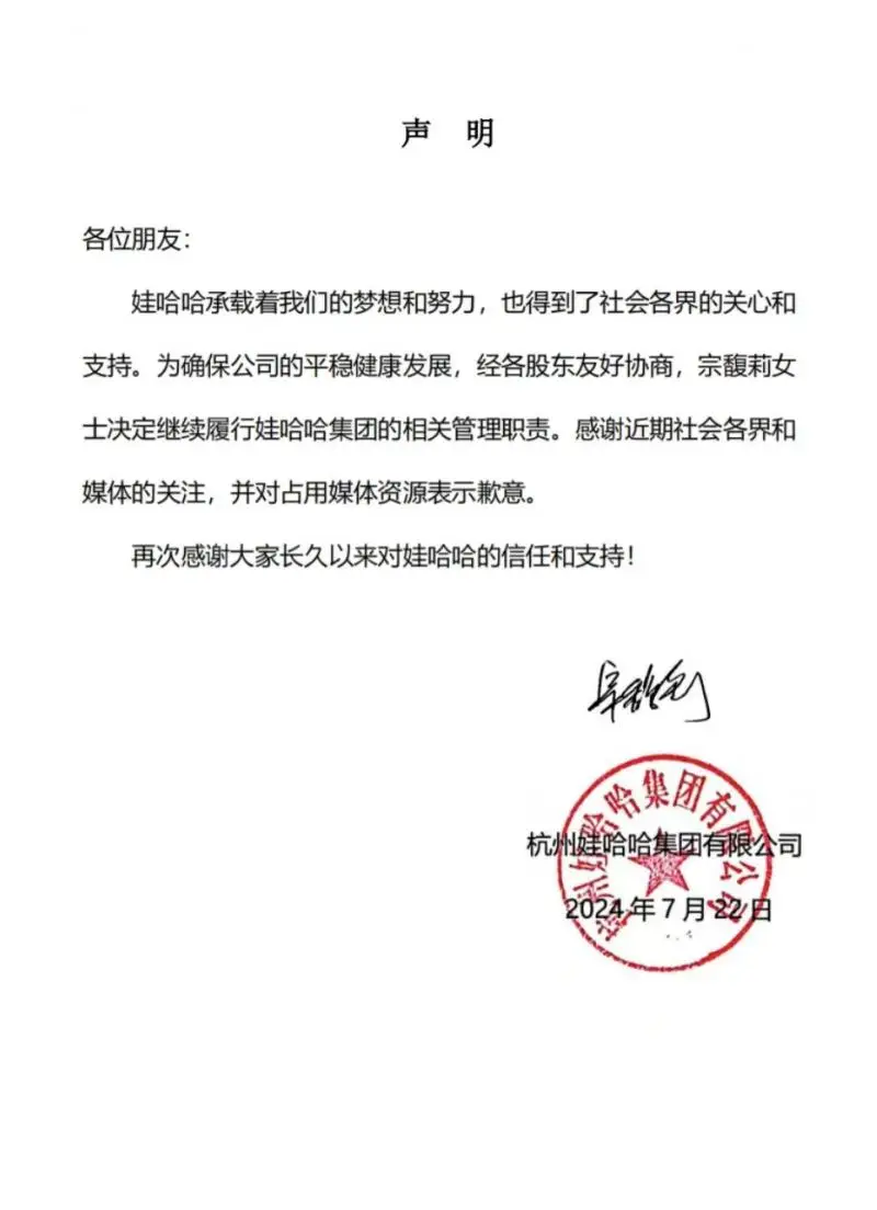 娃哈哈宣布宗馥莉继续履行集团管理职责 无忌 • 2024-07-22 23:07 • 业界 7 月 22 日,娃哈哈发布声明称,为确保公司的平稳健康发展,经各股东友好协商,宗馥莉女士决定继续履行娃哈哈集团的相关管理职责。这份声明附有宗馥莉的签名。上周,一封宗馥莉签署的辞职公开信在网上流传,引发广泛关注和热议。 本站电报频道 / 电报群 赞 (0) 无忌 0 0 生成海报 发表回复 您的邮箱地址不会被公开。 必填项已用 * 标注*昵称: *邮箱: 网址: 记住昵称、邮箱和网址,下次评论免输入 提交