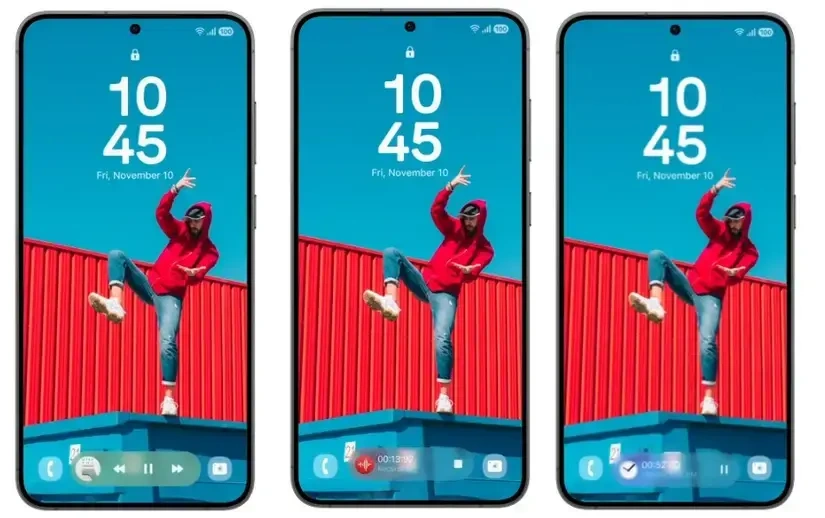 一组据称是 One UI 7 的界面截图在社交媒体流传,截图显示,在 One UI 7 的锁屏底部将出现一个类似苹果” 灵动岛” 的功能变体。该区域一位于两个快捷方式之间,可显示音乐应用的控制条、计时器进度和录音小部件等功能。两个位于左右两侧的快捷方式可能允许自定义。此外,One UI 7 将为常用应用程序提供全新设计的图标,包括电话、相机、计算器和设置等。同时支持用户自定义图标。