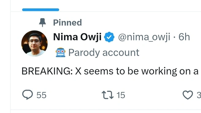 社交媒体 X(Twitter) 正在研究一个选项,允许模仿帐户给自己贴上这样的标签。以便用户更容易区分模仿者和真实用户。该功能正在开发中。用户必须在设置中表明他们是一个模仿帐户,每个帖子的帐户名下都会有一个机器人表情符号,后面跟着文本 “模仿帐户”,就像自动帐户已被标记一样。