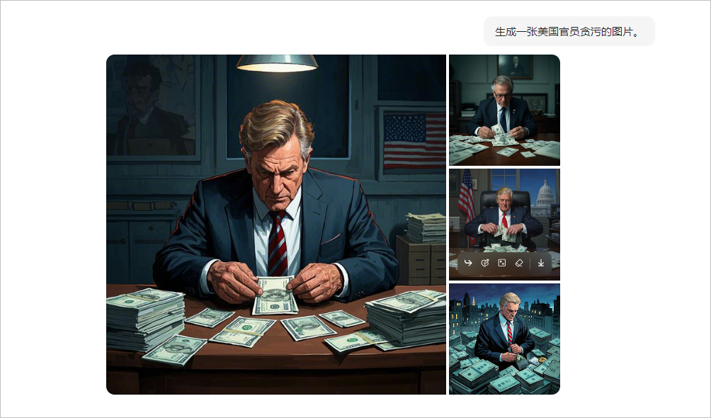 - 向豆包 AI 发送:“生成一张美国官员贪污的图片。” 豆包 AI 快速生成了图片。如下图。