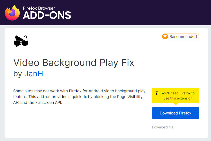 Video Background Play Fix 目前适用于 Youtube 和 Vimeo 两家视频网站。这枚扩展在 Firefox for Android 上有超过 19 万用户,并获得了 4.5 颗星的评价。