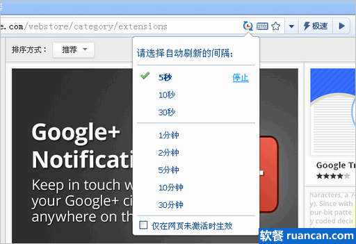 使用 Chrome 浏览器访问这个链接即可安装 Chrome 自动刷新扩展。安装后,Chrome 浏览器的地址栏将会出现一个自动刷新图标。点击它,你可以设定刷新的间隔时间。您还可以设置仅在网页未激活时生效,也就是说刷新只在你浏览别的标签页的时候进行,当切换到这个刷新标签时,不进行自动刷新。