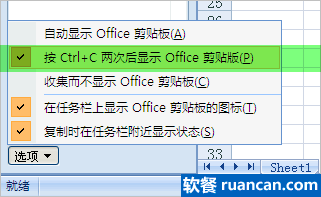 首先需要对 Excel 进行下简单设置。点击 Excel 2007 的开始菜单下方 “剪贴板” 右侧的小箭头(如下图),点击下面的 “选项” 按钮,勾选 “按 Ctrl+C 两次后显示 Ofiice 剪贴板” 。