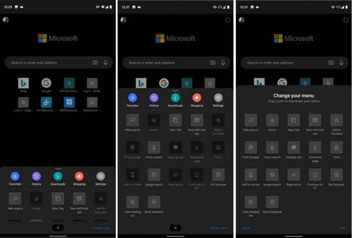 目前用户无法更改第一行的按钮排序,第一行分别为 “收藏夹”,“历史记录”,“下载”,“购物” 或 “设置”,但是可以更改其他按钮。您可以通过单击屏幕右下角的 “更改菜单” 选项来执行此操作。单击后,您可以在快捷方式和图标上四处拖动,因此只需在 “控制中心” 上向上滑动而不是导航菜单即可访问它们。可以添加的选项包括在页面上查找,语音搜索,桌面站点,下载页面,打印,添加到屏幕,图像搜索,大声朗读、在 PC 上继续浏览和退出浏览器。