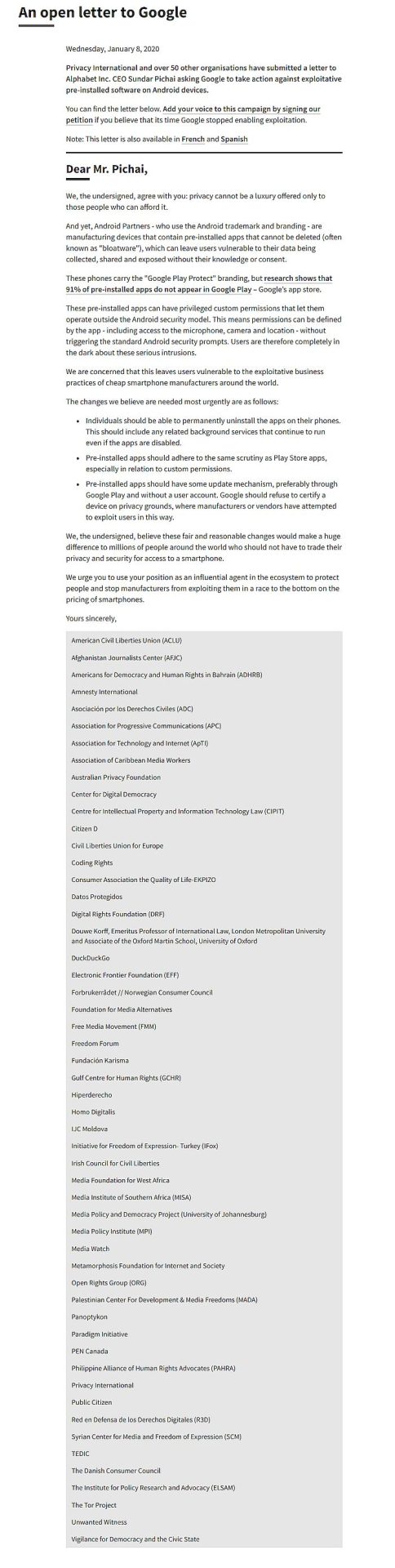 包括国际隐私组织、数字权利基金会,DuckDuckGo 和电子前沿基金会在内的 50 多个组织,近日向 Alphabet 和 Google 首席执行官 Sundar Pichai 发出公开信,就 Android 设备预装软件所存在的漏洞以及它们如何给消费者带来隐私风险表明了自己的立场。