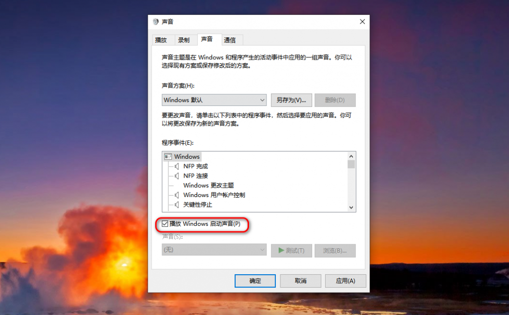 3. 在 “声音控制面板” 中,切换到 “ 声音”选项卡,然后选中 “播放 Windows 启动声音”,然后单击 “应用” 。