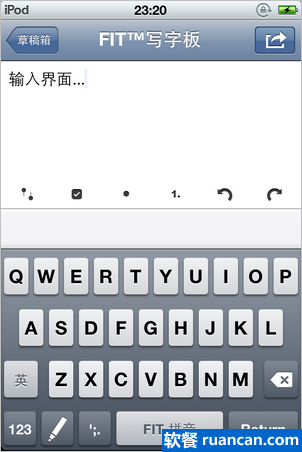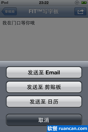 FIT? 写字板内置了多种输入法。这意味着你的 iPhone 不需要越狱,就能享受多种好用的输入法,当然这仅限于 FIT? 写字板内部。不过它允许你在写完记事内容之后,将内容一键发送到电子邮件、手机短信或者剪贴板,也就意味着,如果手机没有越狱,你可以把 FIT? 写字板作为快速输入的入口,写好以后发送到你需要的地方就行了。下面这张图是软餐用 iPod 的测试效果,所以当然没有 “发送到短信” 选项。