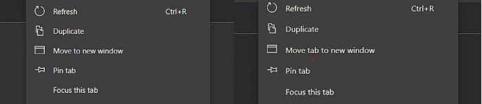 在标签页右键菜单中添加了移动多个标签页到新窗口的选项。此外能够正确处理固定的标签页,并在新窗口中继续保留固定状态。