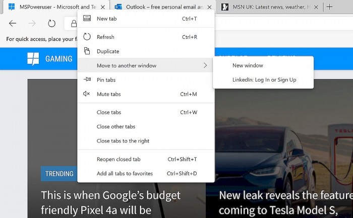 基于 Chromium 的 Edge 浏览器拥有一项比较低调却很酷炫的标签页管理功能– 它能够让你轻松地将选项卡转移到其他浏览器窗口。想要使用这项功能,你只需要 Shift+左键选中 1 个或者多个标签页,右键菜单选择 “移动到另一个窗口”,然后选择你想要发送标签页的目标窗口就可以了。