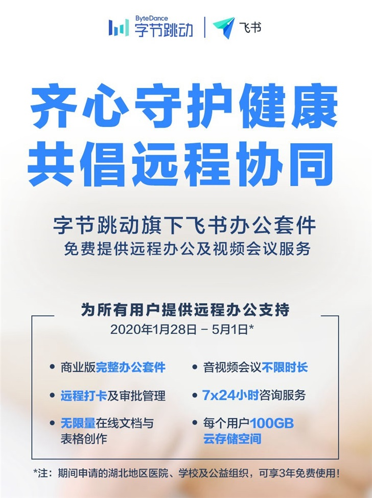 飞书相关负责人表示,春节以来受疫情影响,不少公司为员工安全考虑,推迟开工时间,并实行在家办公。在这样的特殊时期,更需要信息精准快速的传达,及社会各组织高效协作运转。为减少人群聚集,并帮助社会各组织恢复正常运行秩序和高效协作,飞书决定免费为全体用户提供远程办公支持。其中,对在上述时间内申请的所有湖北地区医院、学校及公益组织,飞书将持续提供三年的免费服务。