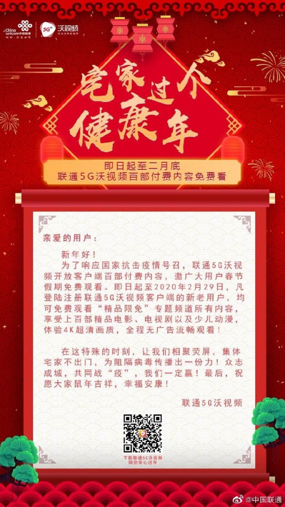 联通 5G 沃视频表示,为了响应国家抗击疫情号召,联通 5 G 沃视频开放客户端百部付费内容,邀广大用户春节假期免费观看。即日起至 20 20 年 2 月 29 日,凡登陆注册联通 5G 沃视频客户端的新老用户,均可免费观看 “精品限免” 专题频道所有内容,享受上百部精品电影、电视剧以及少儿动漫,体验 4 K 超清画质,全程无广告流畅观看!