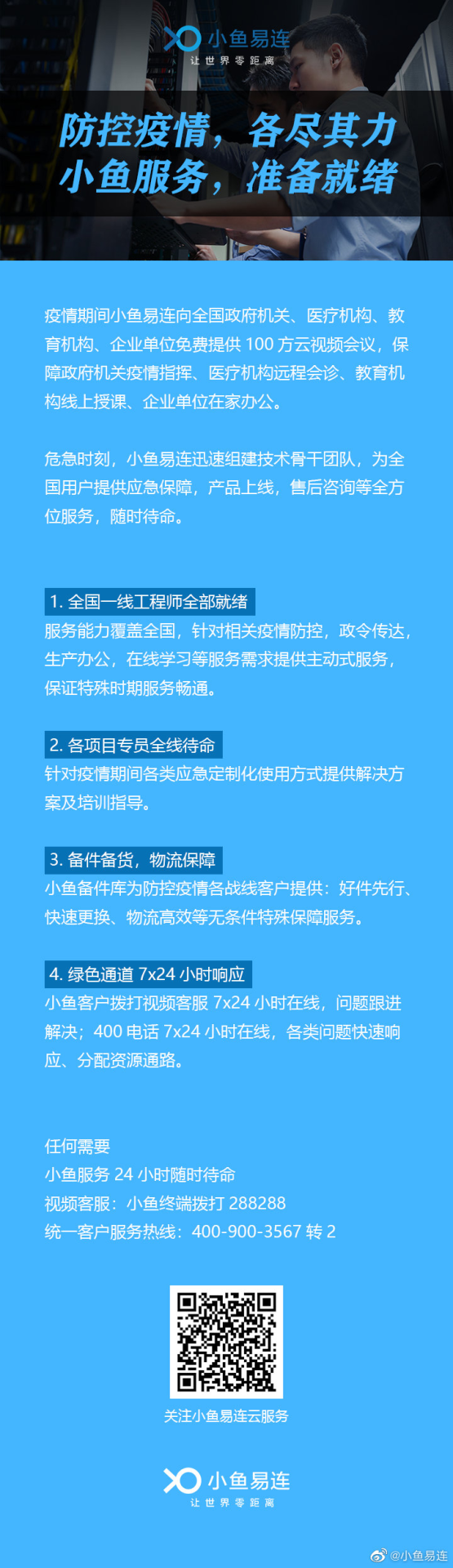 小鱼易连是一家云视频生态系统公司。从 1 月 26 日起至疫情结束,向全国政府机关、医疗机构、教育机构、企业单位免费提供 100 方云视频会议,保障政府机关疫情指挥、医疗机构远程会诊、教育机构线上授课、企业单位在家办公。