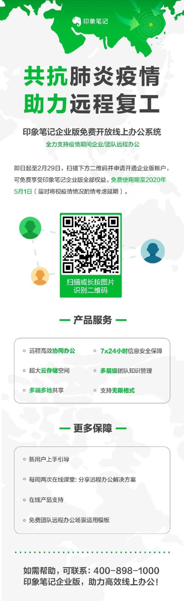 在此期间,印象笔团队将为用户提供免费的远程办公在线课堂、 7×24 小时信息安全保障等一系列保障服务。