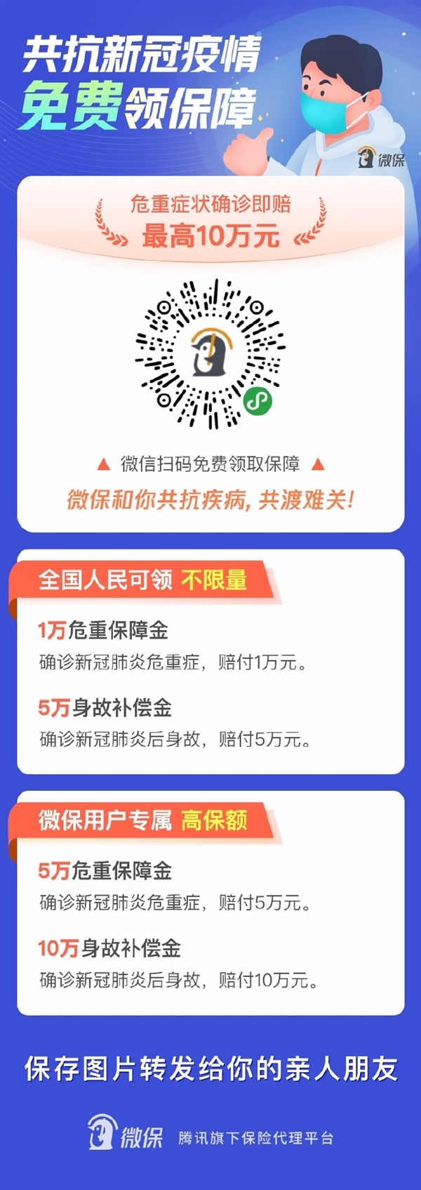 2 月 6 日消息,腾讯旗下保险平台微保宣布上线 “微医保·免费新冠肺炎保障金”,全民可免费领取,确诊后普通人最高可领 5 万,微保用户可领 10 万。