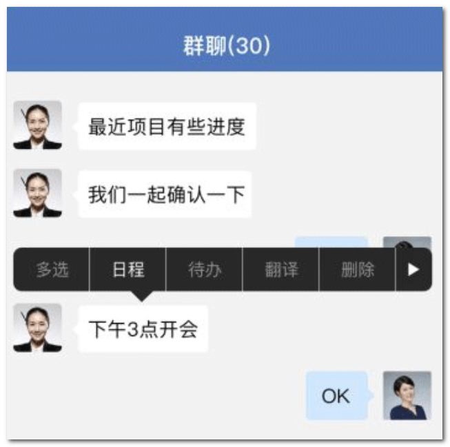 日程设置:聊天里直接长按消息可设为日程,既可给自己单独添加,也能新建和同事共享的日程。