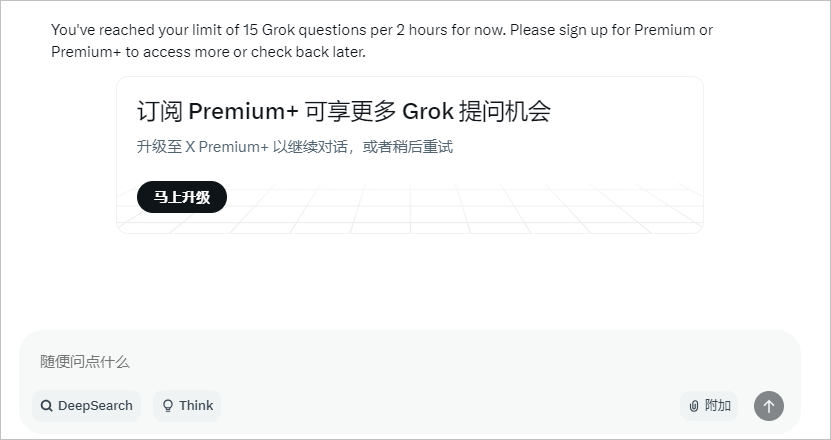 [实测] X 平台将 Grok 3 免费版限制为每两小时提 15 个问题 志锋 • 2025-02-21 16:34 • 网络应用 你已经达到了每 2 小时 15 个 Grok 问题的限制。请注册 Premium 或 Premium+以访问更多内容或稍后再来。 软餐实测看到,X 平台提供的免费版 Grok 3 的提问限制似乎为每 2 小时 15 个问题,到达上限后我们收到了上述提示。用户需稍后再访问该服务或注册 Premium 或 Premium+订阅以获取继续提问的机会。 本站电报频道 / 电报群 赞 (0) 志锋 0 0 生成海报 发表回复 您的邮箱地址不会被公开。 必填项已用 * 标注*昵称: *邮箱: 网址: 记住昵称、邮箱和网址,下次评论免输入 提交