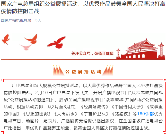 国家广电总局近日宣布,为满足全国各地人民群众居家抗疫的文化需要,启动全国广播电视节目 “众志成城 共同战疫” 公益展播活动。从 2 月至 8 月底,《经典咏流传》《中国诗词大会》《故事里的中国》《思想的田野》《大禹治水》《宇宙护卫队》《猪猪侠》等 180 余部电视节目、动画片、纪录片、广播剧将无偿提供播出版权,在全国各级广播电视台播出。