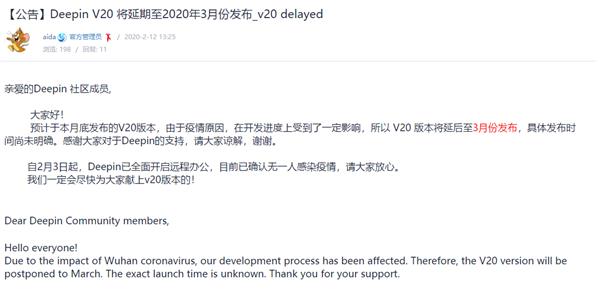 预计于本月底发布的 V20 版本,由于疫情原因,在开发进度上受到了一定影响,所以 V20 版本将延后至 3 月份发布,具体发布时间尚未明确。感谢大家对于 Deepin 的支持,请大家谅解,谢谢。