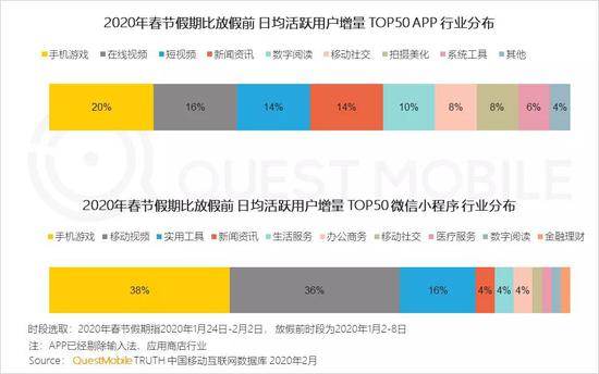 3、在用户规模增量方面,手机游戏、视频等领域受益明显;在微信小程序中,查询获取疫情信息的实用工具、新闻资讯和生活服务类产品表现突出,在增量 TOP50 中占比达到 24%