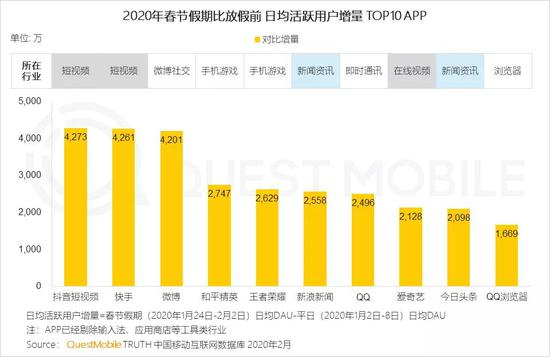 4、快手、抖音因合作央视和地方卫视春晚,用户增量均超过 4000 万,随着疫情的持续发展,社交、新闻资讯等平台是很多信息重要来源,用户增长明显