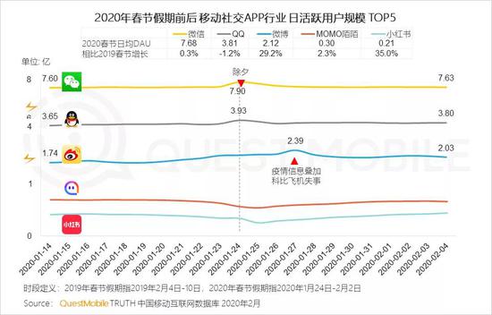 1.2 微信、 QQ 的活跃用户规模在除夕之夜迎来峰值,随着疫情的持续发酵,叠加科比飞机失事等事件,微博在大年初三的用户规模较平日上涨 37.5%