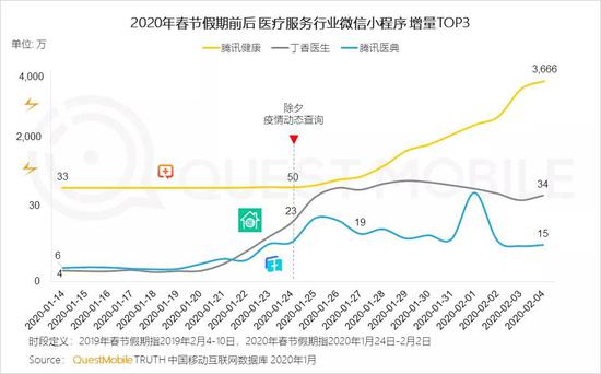 5、在微信小程序中,医疗服务、生活服务、新闻资讯等帮助用户更快捷地了解疫情信息的平台也获得快速增长