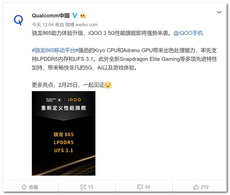 高通中国资料介绍称,#骁龙 865 移动平台 #强劲的 Kryo CPU 和 Adreno GPU 带来出色处理能力,率先支持 LPDDR5 内存和 UFS 3.1 。此外全新 Snapdragon Elite Gaming 等多项先进特性加持,带来畅快非凡的 5G 、 AI 以及游戏体验。
