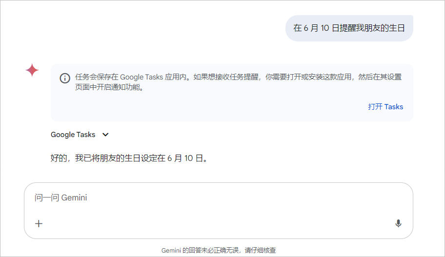 软餐实测发现,Gemini 现在可通过唤出 Google Tasks 应用来响应和执行生日提醒任务,但对于 “每日发送新闻简报” 的要求 Gemini 则回应说 “我没有能力发送定时的、主动的消息。” 推测谷歌的新功能发布仍在进行。