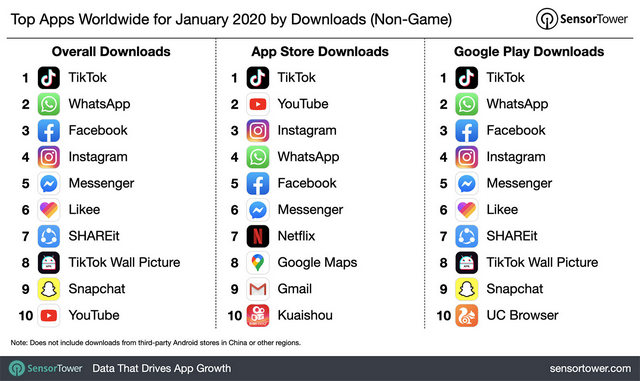 一月份,广受欢迎的短视频应用 TikTok 取代了 WhatsApp,成为全球下载量最大的应用程序。