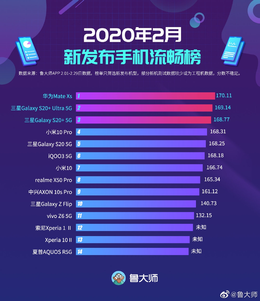 3 月 2 日消息,今日,鲁大师公布了 2 月新发布手机流畅度排行榜 TOP14 。榜单显示: 搭载 EMUI10 的折叠屏手机华为 Mate Xs 拿下第一名,分数高达 170.11 分。第二名第三名均被三星拿下,小米 10 Pro 排名第四。