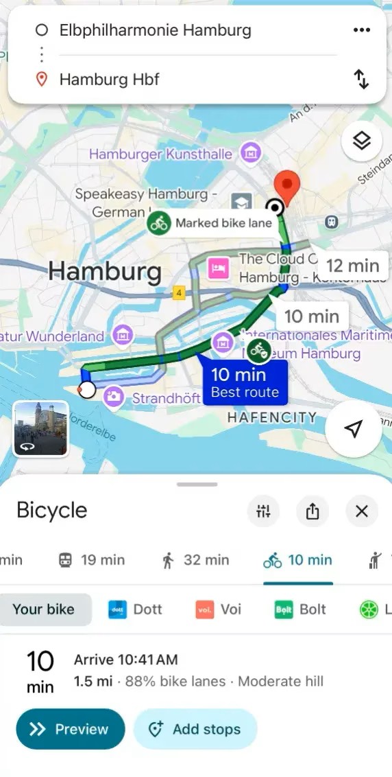 Google Maps 近日完成更新,可为用户提供更多欧洲城市的自行车路线。谷歌在官方博客中表示,巴塞罗那、布鲁塞尔、布达佩斯、汉堡、米兰、罗马、苏黎世和维也纳的骑行用户今后可通过谷歌地图查询自行车道数量、车道拥堵状况及海拔变化等信息。该功能开发过程中,谷歌与各地政府机构合作,由后者提供必要数据支持。