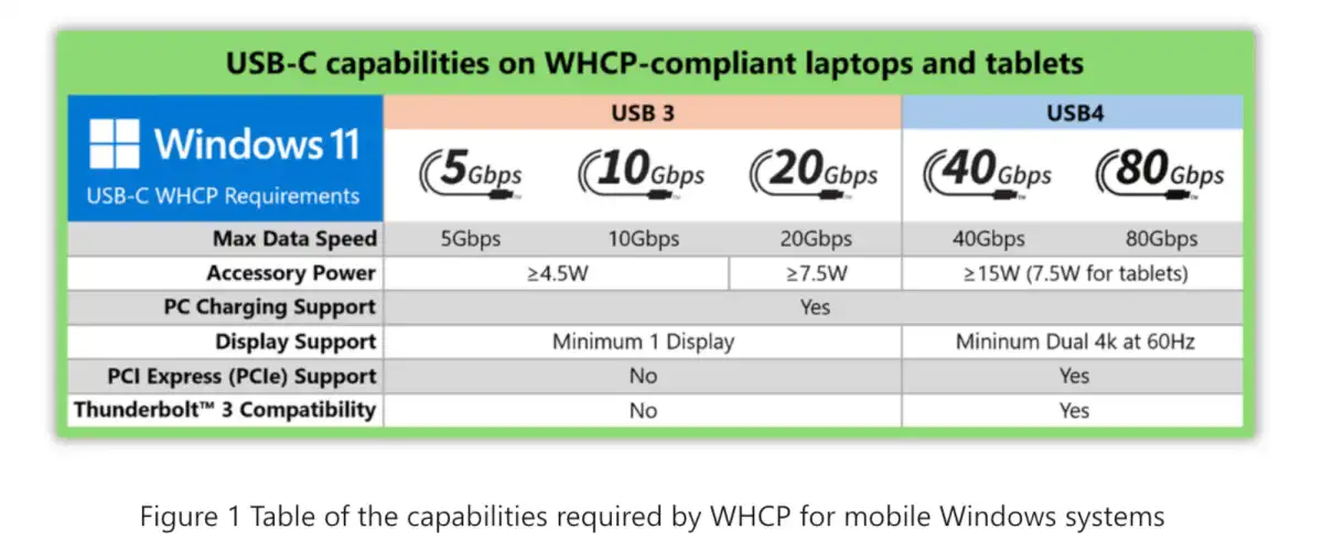 从 Windows 11 24H2 版本开始,微软将强制所有 Windows 11 笔记本厂商执行统一的 USB-C 标准规范。这意味着未来所有 Windows 笔记本的 USB-C 接口都必须按照微软制定的规格来设计。虽然 USB-C 接口理论上可以支持最高 240W 充电功率和 80Gbps 传输速率(连接显示器时甚至能达到 120Gbps),还能兼容 DisplayPort 和 Thunderbolt 协议,但由于之前这些规范都是可选的,导致不同厂商的产品在性能表现上千差万别。这种混乱给用户带来了不少麻烦。例如用户使用随手的 USB-C 线连接显示器,结果屏幕无法点亮。由于缺乏统一标准,出现此类问题时很难判断原因。为此,微软决定通过”Windows 硬件兼容性计划(WHCP)” 来建立 USB-C 接口的强制标准。所有带有 WHCP 认证标识的新款 Windows PC 都必须满足以下基础要求: