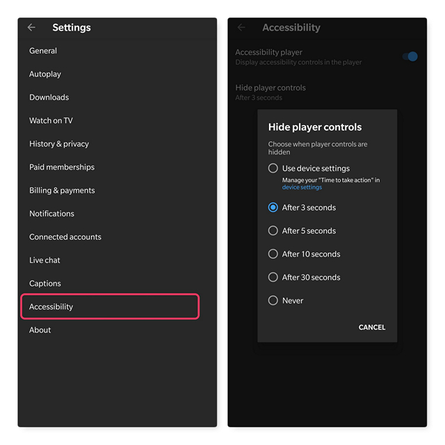 辅助功能使您可以设置播放器控件的超时。该功能提供【3 秒,5 秒,10 秒或 30 秒】几个选项,可设置播放器何时从视频播放屏幕上消失。