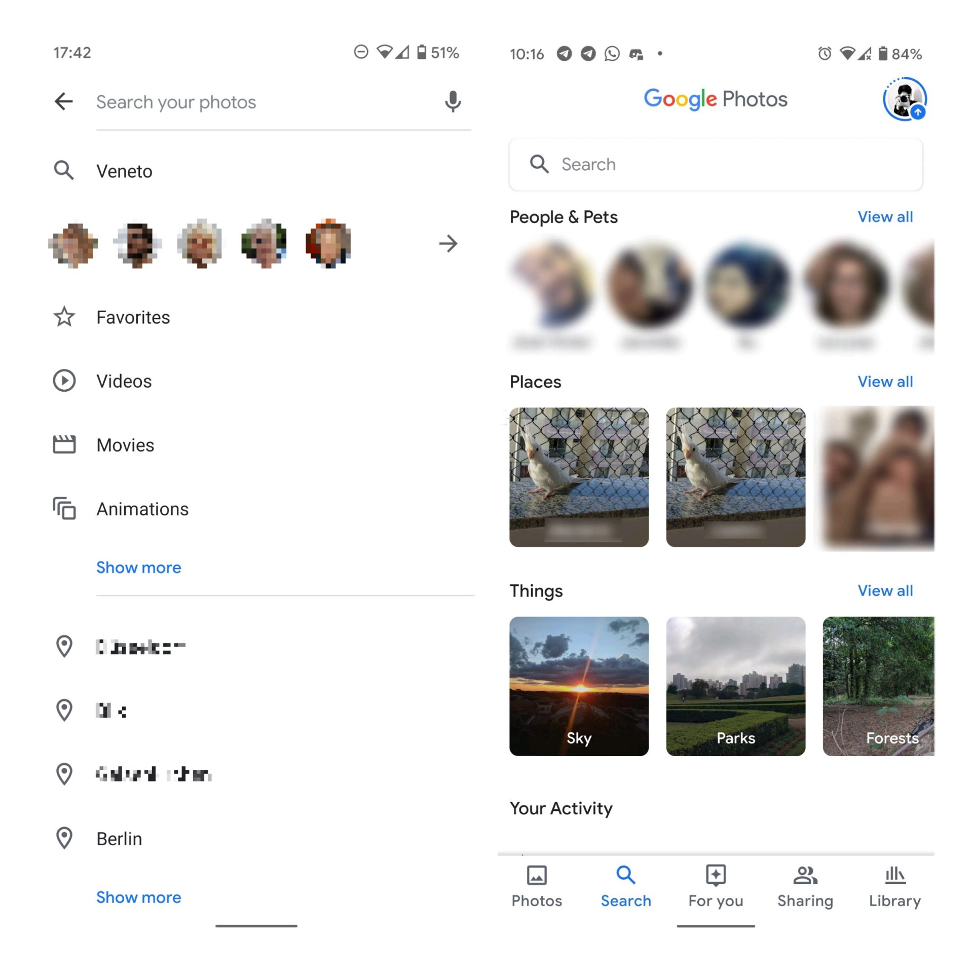 进入 “搜索” 界面,很明显,谷歌相册已优先考虑增强类别的视觉吸引力。例如,“人与宠物” 比以前的旧设计更加突出。 “地点” 和 “事物” 也是如此。