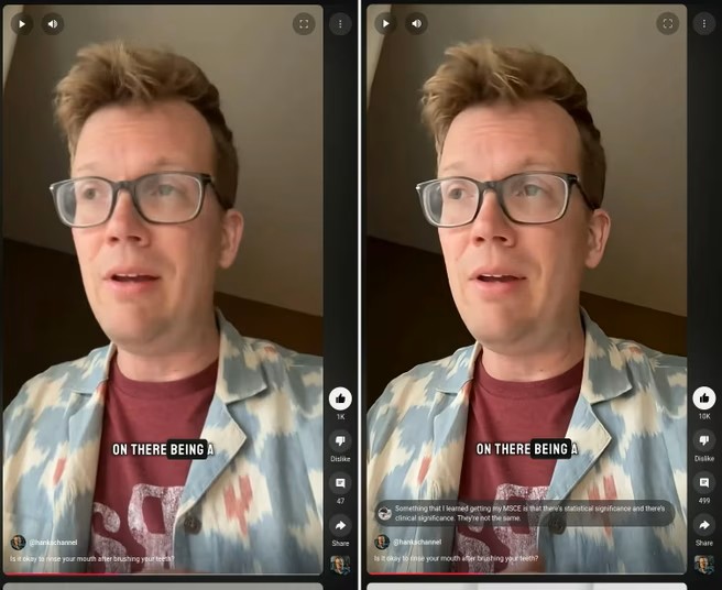 该声明似乎证实了部分用户的猜测——Shorts 正在应用某种画质升级或 AI 滤镜技术。例如有 Reddit 用户通过同一视频的两张截图(拍摄时间相隔不到 12 小时)推测存在画质增强处理:第一张截图显示了 Shorts 视频刚上传时的状态,第二张同帧截图则呈现更清晰的画面,但同时出现类似 AI 图像常见的油润滤镜效果。 YouTube 创作者雷特·舒尔(Rhett Shull)也声称在音乐制作人里克·贝托(Rick Beato)的视频及其 Shorts 内容中发现了相同滤镜效果。