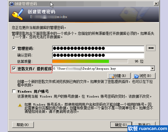 在创建 KeePass 的管理密码时,如果要进一步增强安全性,还可以才用同时使用密码和密钥文件的方式进行登录。也就是说: