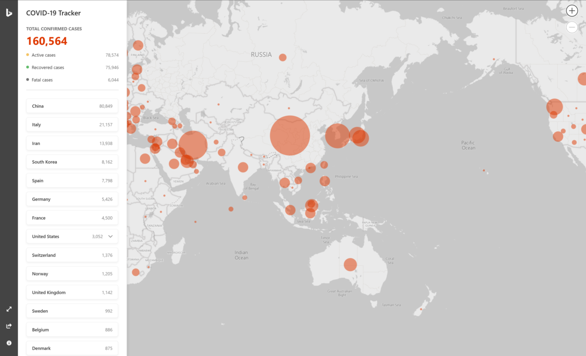 现在,微软已经推出了一个基于搜索引擎 Bing 的全球冠状病毒追踪器(COVID-19 Tracker),该追踪器可以收集和整理互联网上所有可用的数据。跟踪器显示全球和全国范围内的确诊病例、治愈病例和死亡病例数据。这一追踪器还支持根据某个国家/地区查询相关的疫情新闻报道。